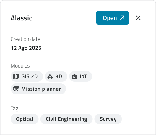• Per aprire un progetto, clicca sul bottone Apri progetto, visibile al passaggio del mouse sopra l'elemento o in alto sul pannello dei dettagli.