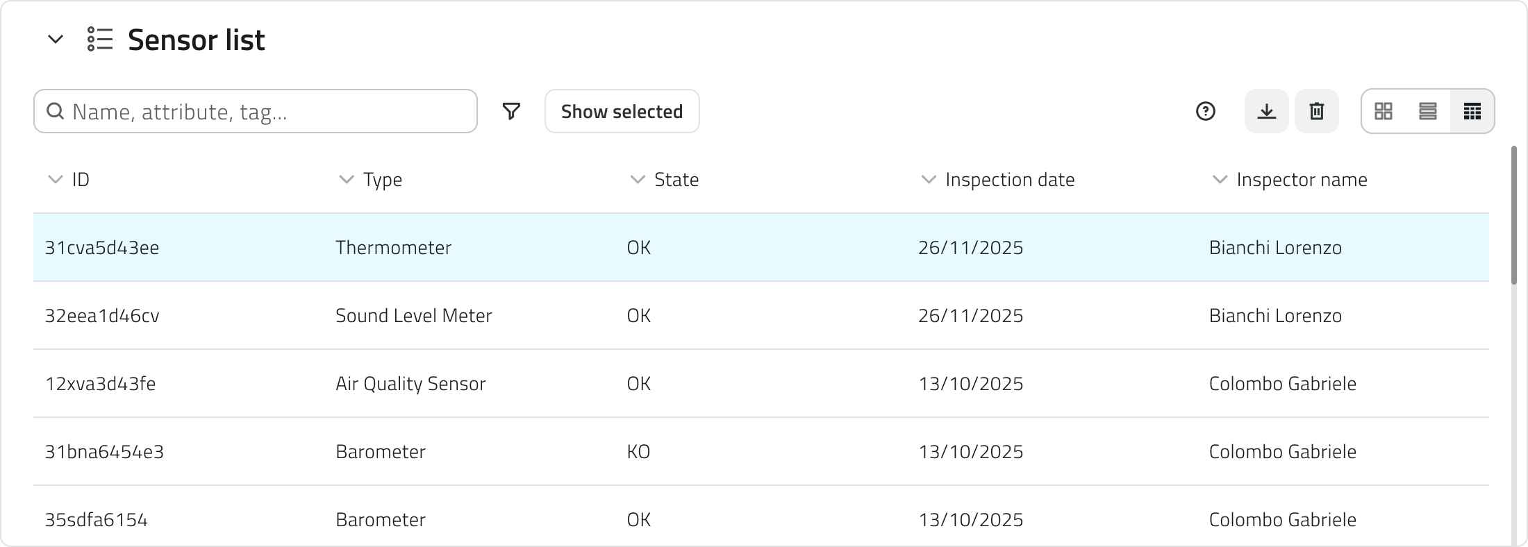 • elenco dei fornitori o dei modelli di sensori;