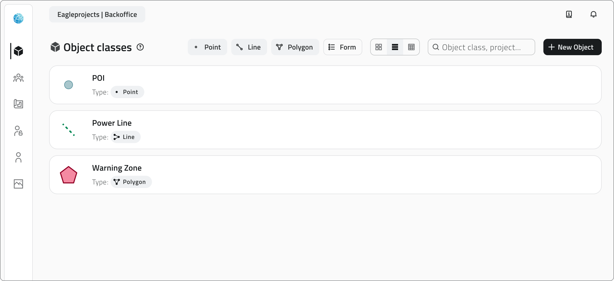 Ogni classe rappresenta un tipo di elemento censibile, per esempio una pianta, un palo, una condotta o un sensore, e stabilisce quali informazioni devono essere raccolte e come l’oggetto deve apparire sulla mappa.
