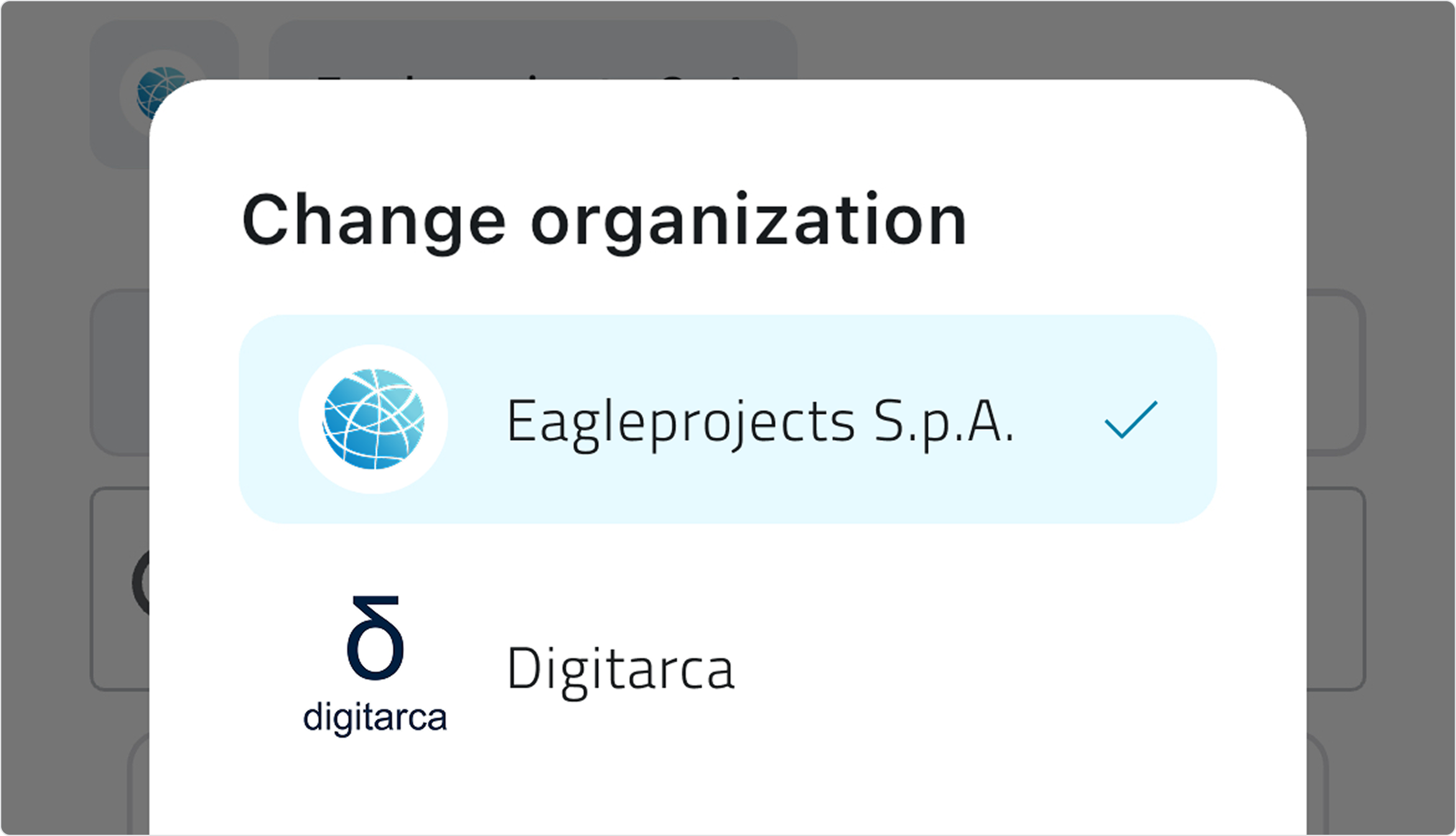 Tocca il bottone con il logo dell’organizzazione per aprire un modale con la lista delle organizzazioni di cui fai parte.
