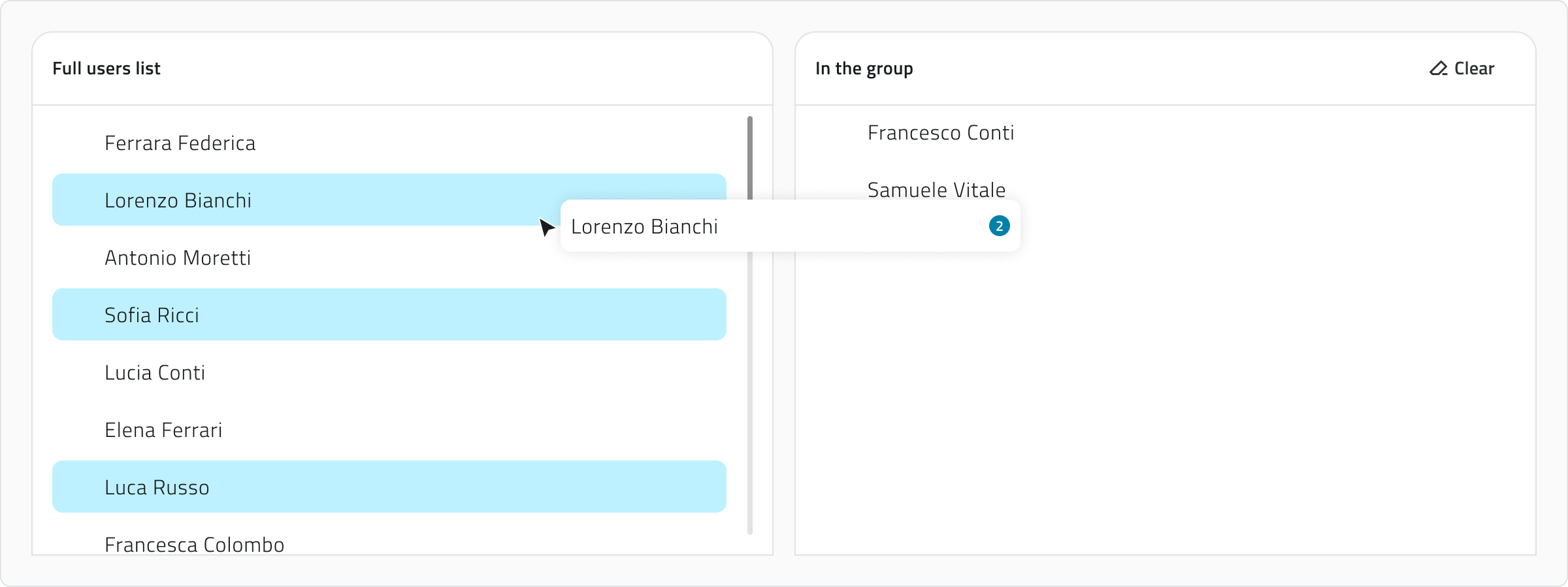 ControloShiftper selezioni multiple) e trascinali nell'area a destra. - Rimuovere: Seleziona gli utenti dalla lista a destra e trascinali nella lista a sinistra o clicca Clear per rimuovere tutti gli utenti.