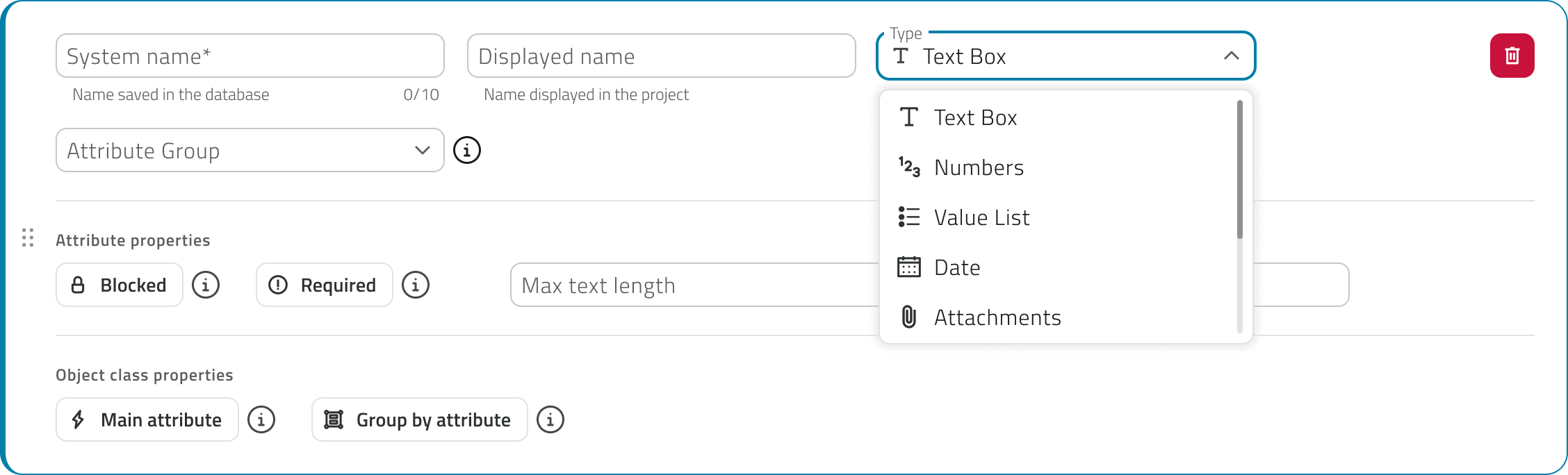 Clicca l'icona + in basso a destra per creare un nuovo attributo e seleziona la tipologia.