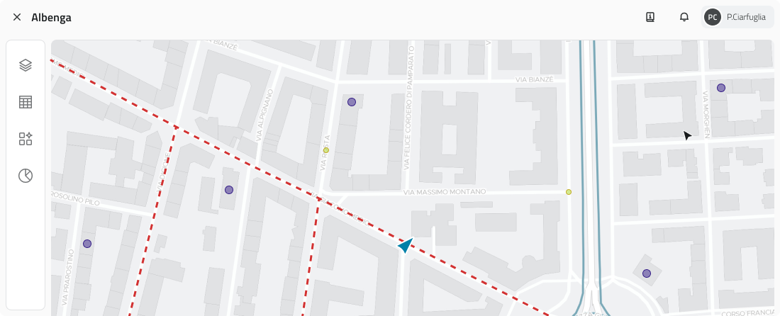 • Vista 2D: Gli oggetti sono georeferenziati sulla mappa.