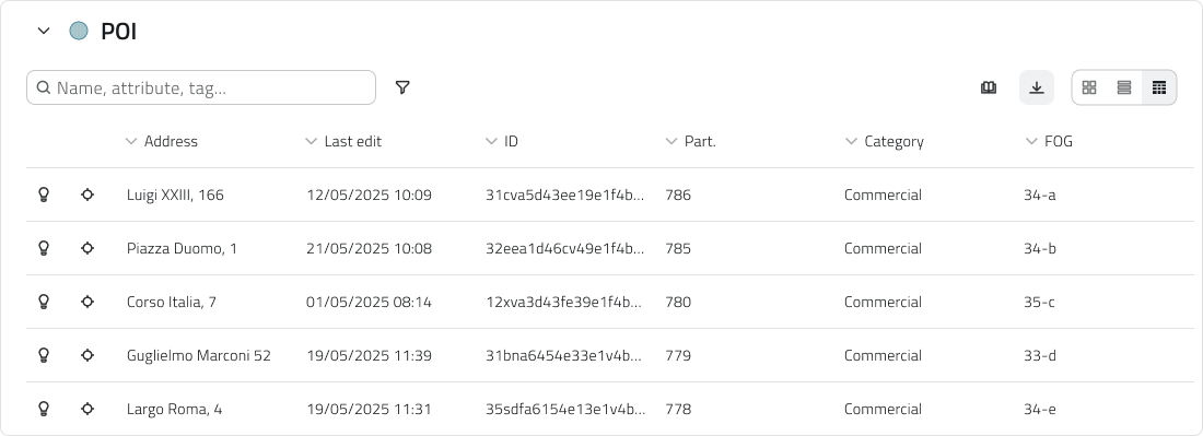 • Vista 2D: Gli oggetti sono georeferenziati sulla mappa.