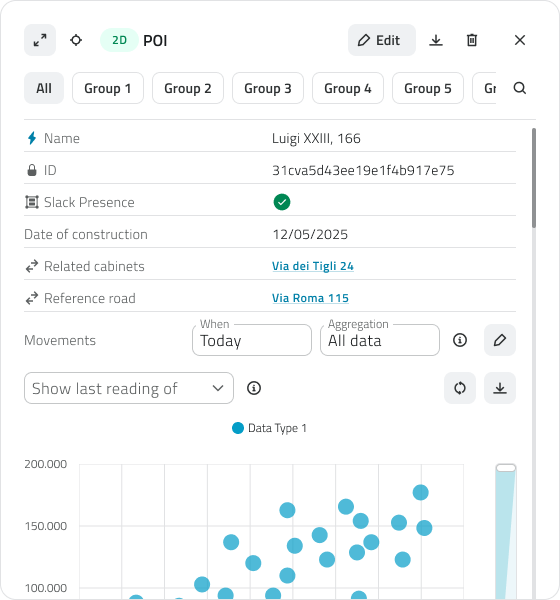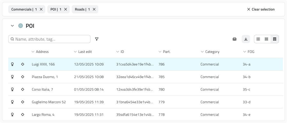 2. Chip di selezione: Clicca su una chip (classe oggetto) comparsa dopo aver selezionato un oggetto in mappa 2D o 3D.