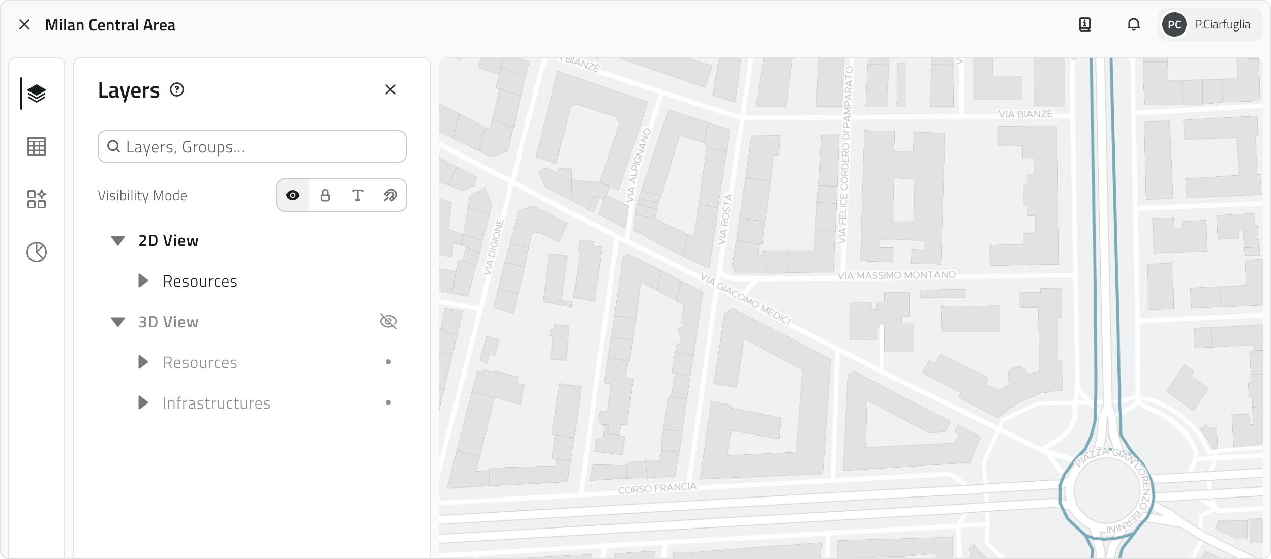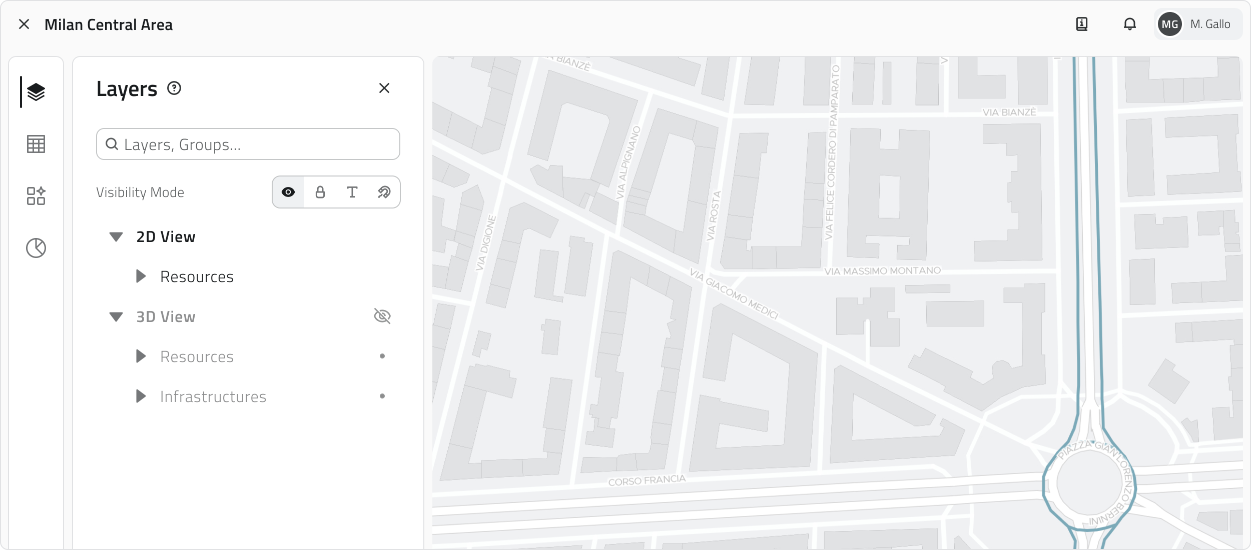 Il Pannello Layers (icona con tre pannelli sovrapposti) permette di gestire la visibilità, il blocco, le etichette e lo snap di classi oggetto e risorse.