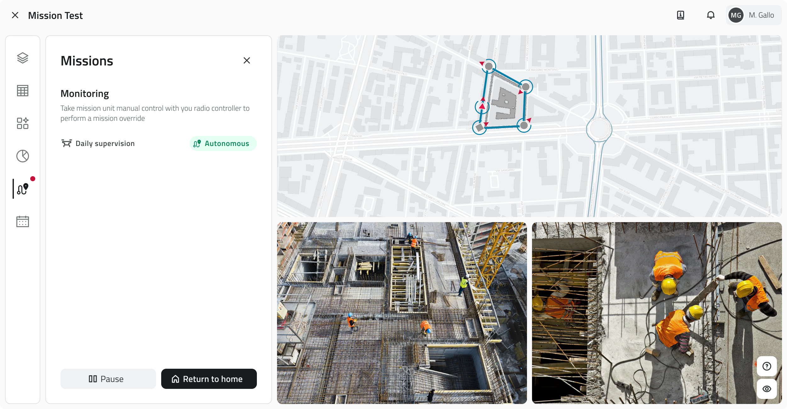 Durante l’esecuzione viene sempre mostrato lo stato corrente della missione. È possibile operare in modalità autonoma o in modalità controllo manuale.