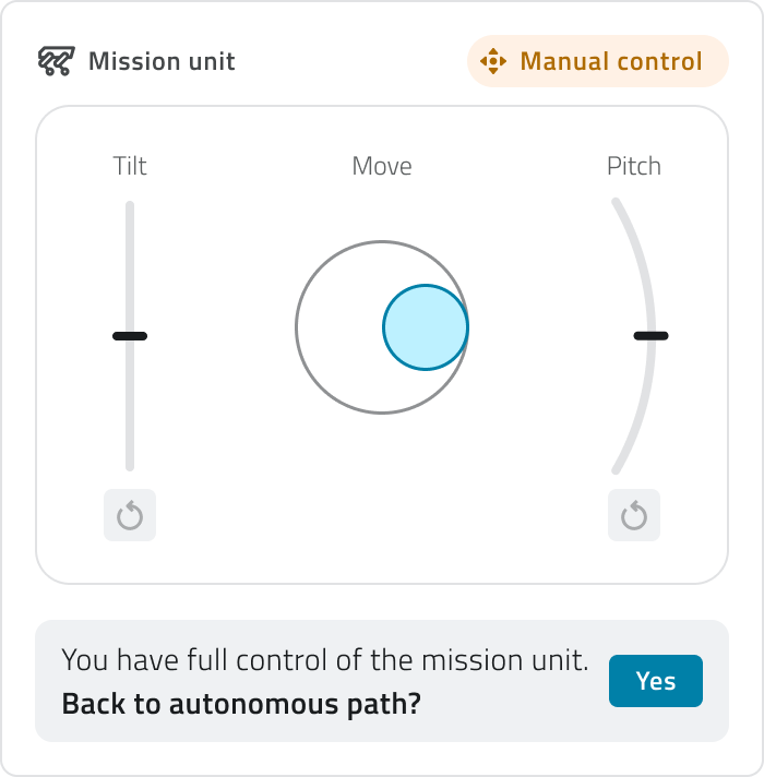 In modalità Manual l’esecuzione autonoma è sospesa e la Mission Unit risponde esclusivamente ai comandi impartiti in tempo reale.